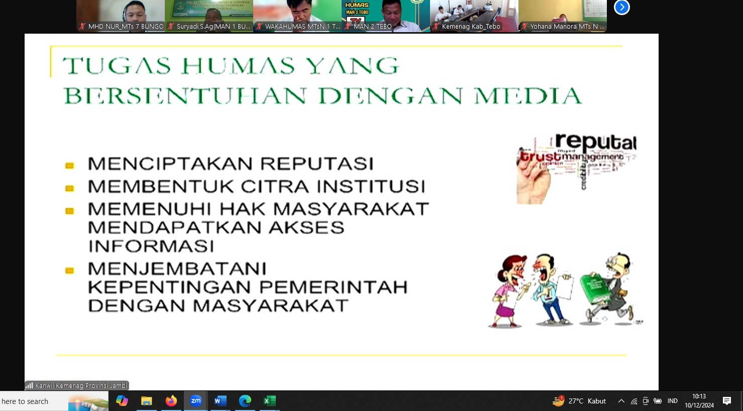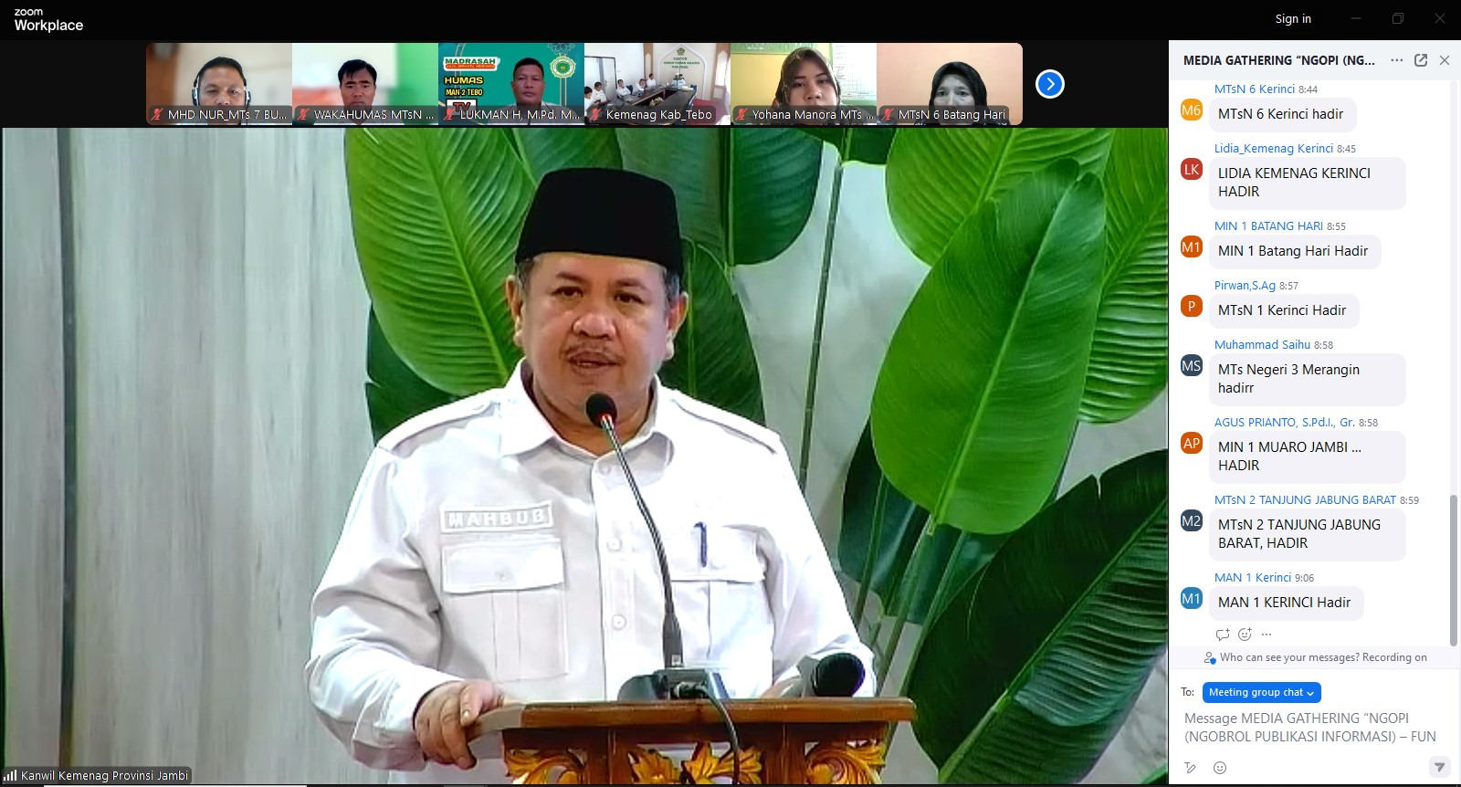 Tanah Tumbuh (Humas MTsN 7 Bungo) - Pengelola Kehumasan Madrasah Tsanawiyah Negeri (MTsN) 7 Bungo mengikuti Kegiatan Media Gathering "Ngopi (Ngobrol Publikasi Informasi) - Fun Synergy With Media yang di selengara oleh Tim Kerja Humas Data dan Informasi Kantor Wilayah Kementerian Agama Provinsi Jambi melalui via virtual Zoom Meeting, Selasa (10/12/2024).