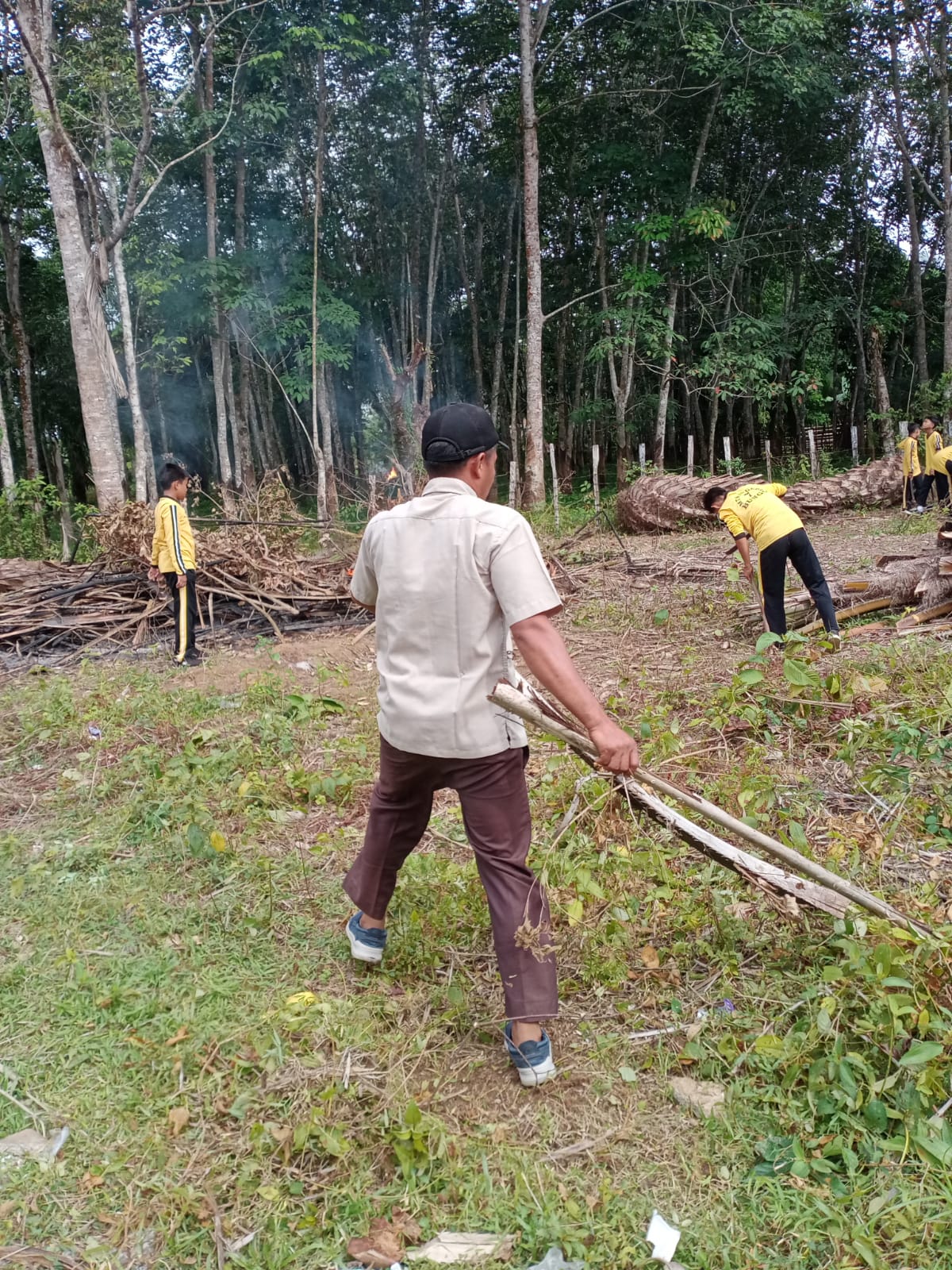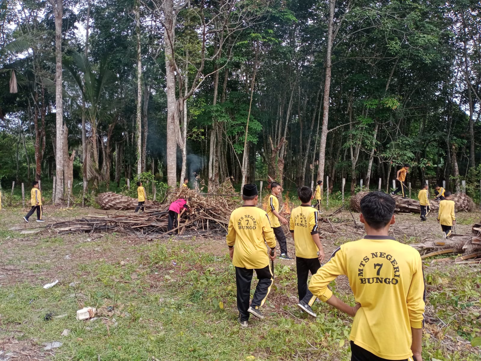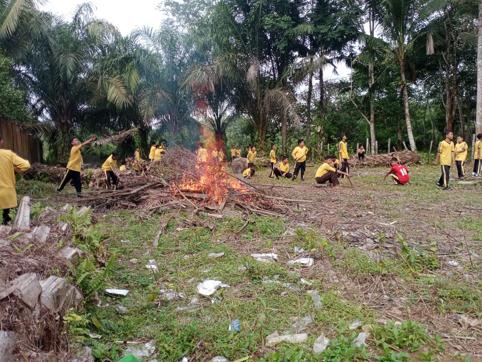 Setelah rangkaian pembersihan area madrasah, seluruh aksi bersih-bersih beranjak ke di lahan baru madrasah yang akan dibangun sarana olah raga yakni lapangan futsal guna melaksanan aksi bersih lahan dengan mengumpul potongan kayu dan potongan pohon kelapa sawit serta membakar tumpukan sampah, sehingga lahan terlihat bersih.