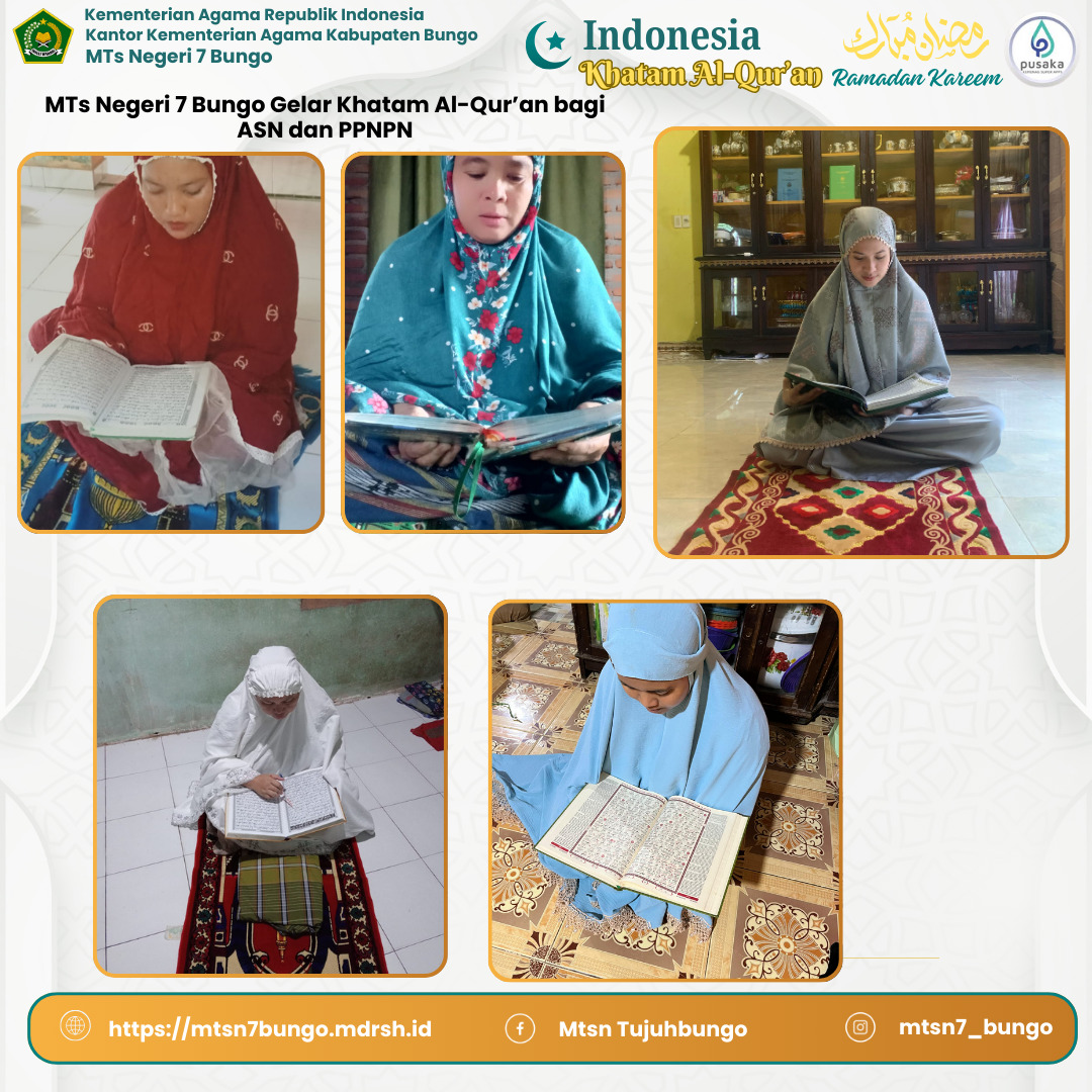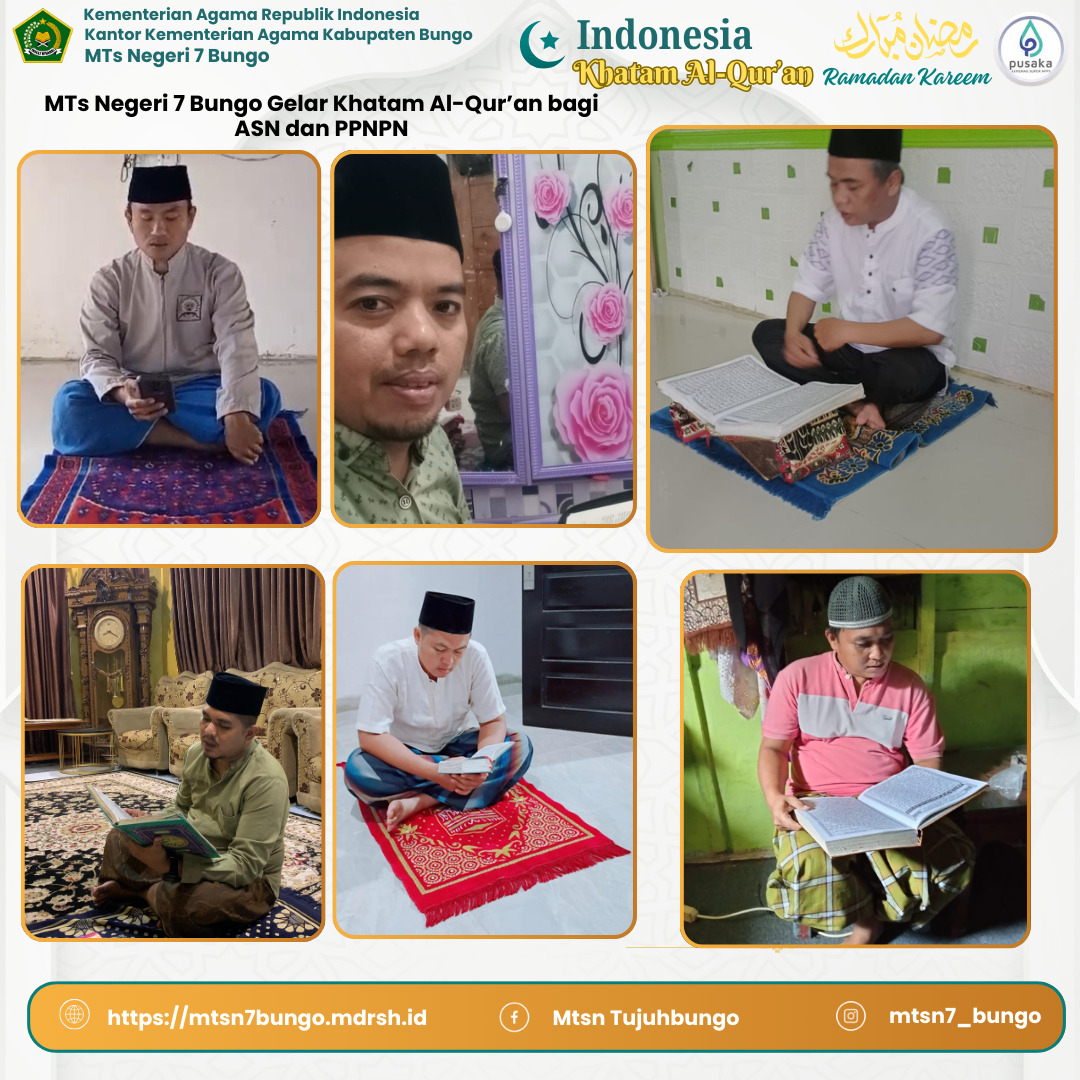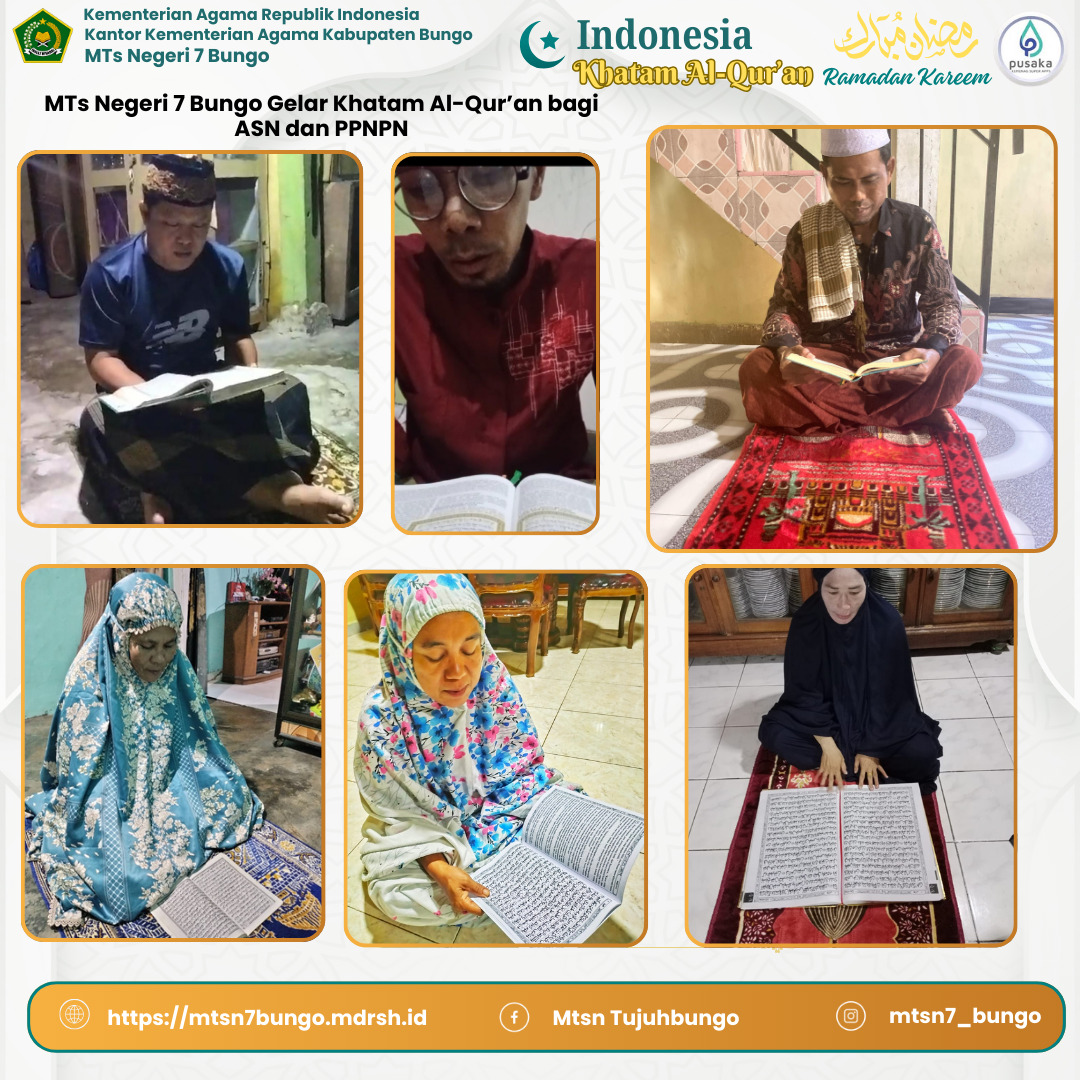 Dalam rangka mendukung dan mensukseskan program Kementerian Agama Republik Indonesia bertajuk “Indonesia Khatam Al-Qur'an†sebanyak 350.000 kali dalam rentang sehari, sebuah gerakan yang bertujuan meningkatkan kecintaan umat Islam terhadap Al-Qur'an, Maka MTsN 7 Bungo menggelar tadarus dan khatam bersama yang diikuti oleh guru dan staf madrasah yang bertempat di kediaman masing-masing. Kegiatan ini dilaksanakan sebagai bentuk dukungan terhadap gerakan nasional Kementerian Agama Republik Indonesia guna menyukseskan target capaian untuk membumikan Al-Qur'an di seluruh penjuru negeri.