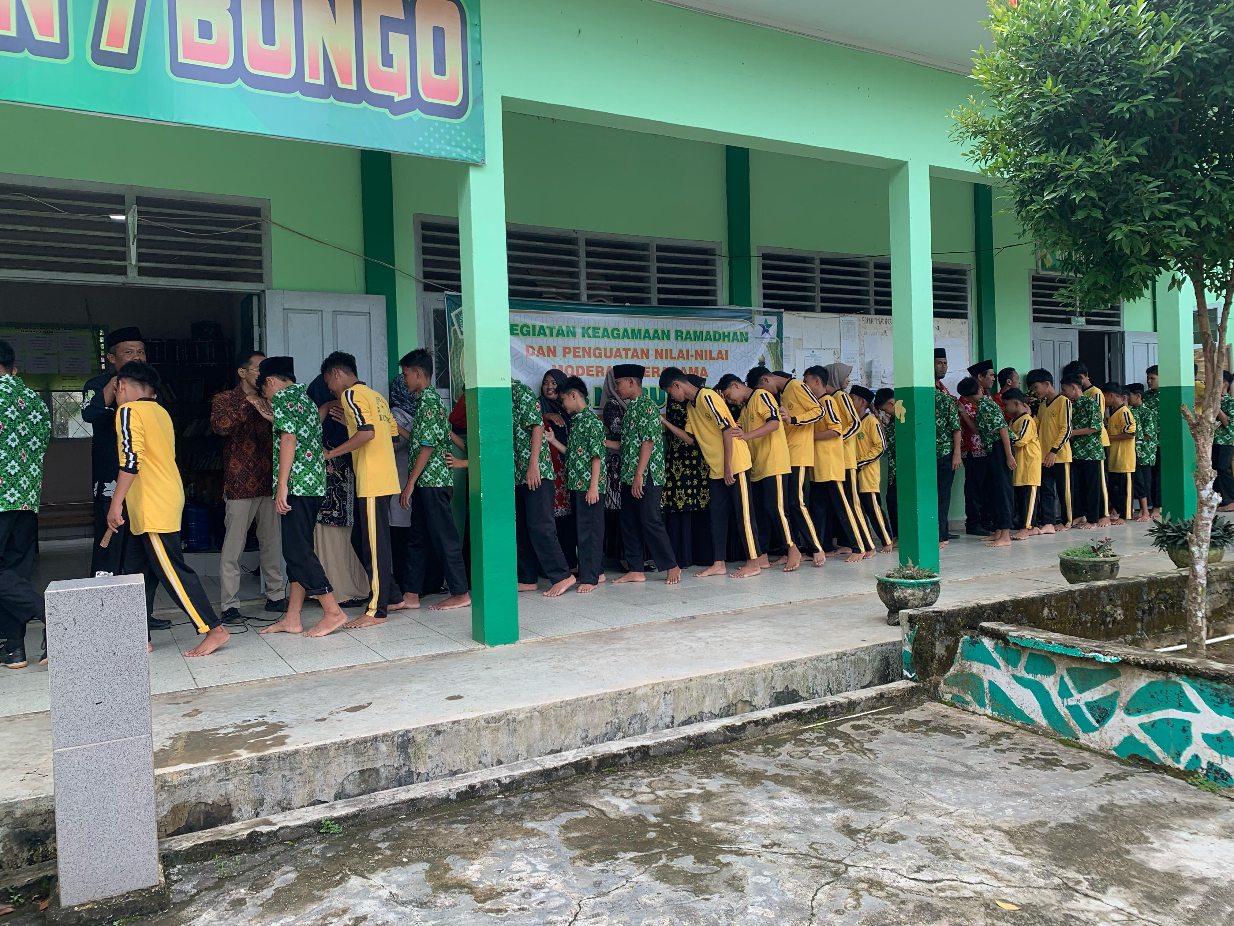 Acara Halal Bihalal yang berlangsung dengan penuh keceriaan dan semangat kebersamaan. Suasana gembira terpancar dari seluruh civitas madrasah. Dengan keikhlasan hati dan kelapangan dada, sembari diiringi senandung Shalawat Nabi SAW seluruh siswa bersalam-salaman saling meminta maaf baik dengan sesama teman, para Guru dan Tenaga Kependidikan MTs Negeri 7 Bungo.