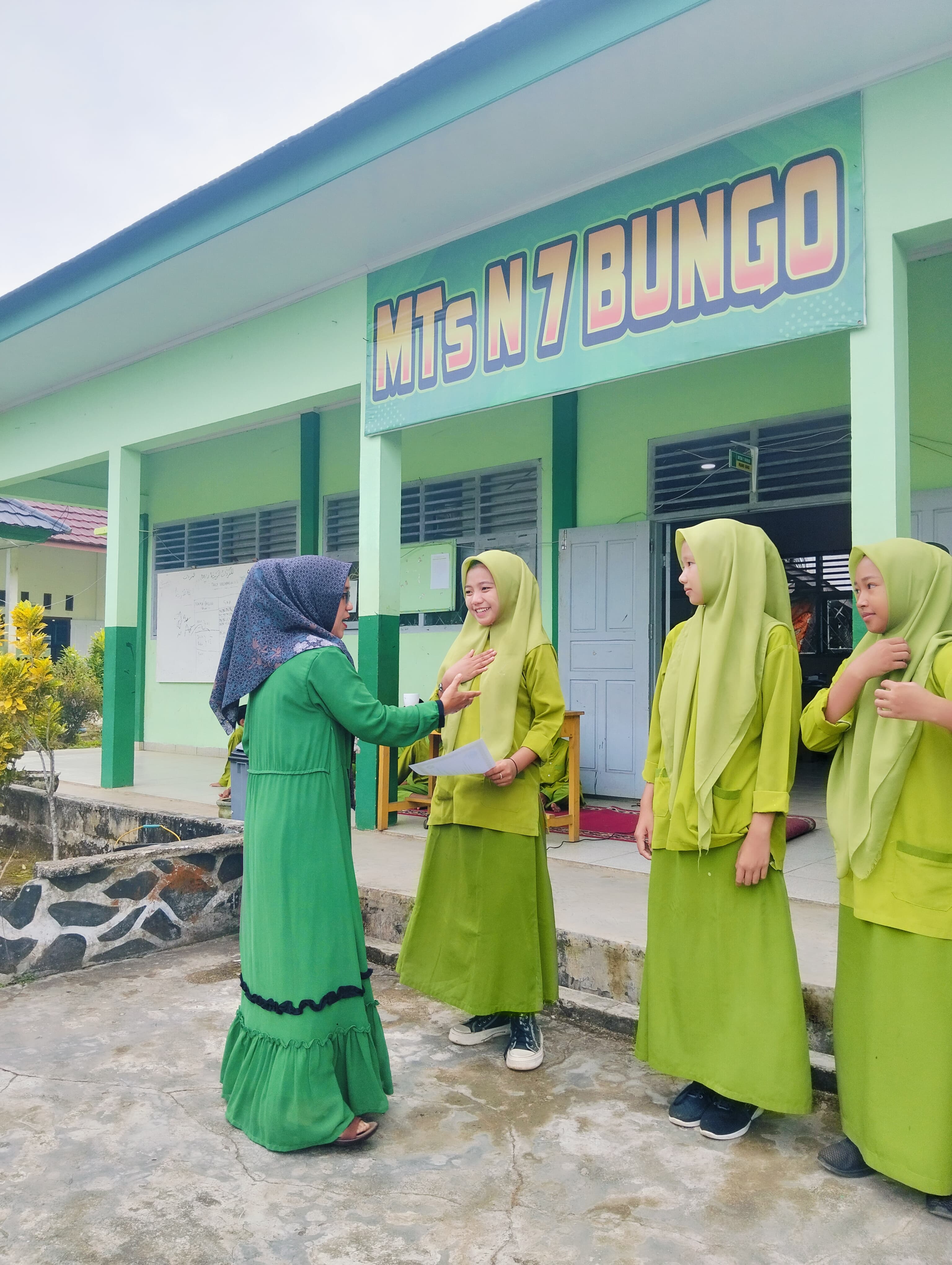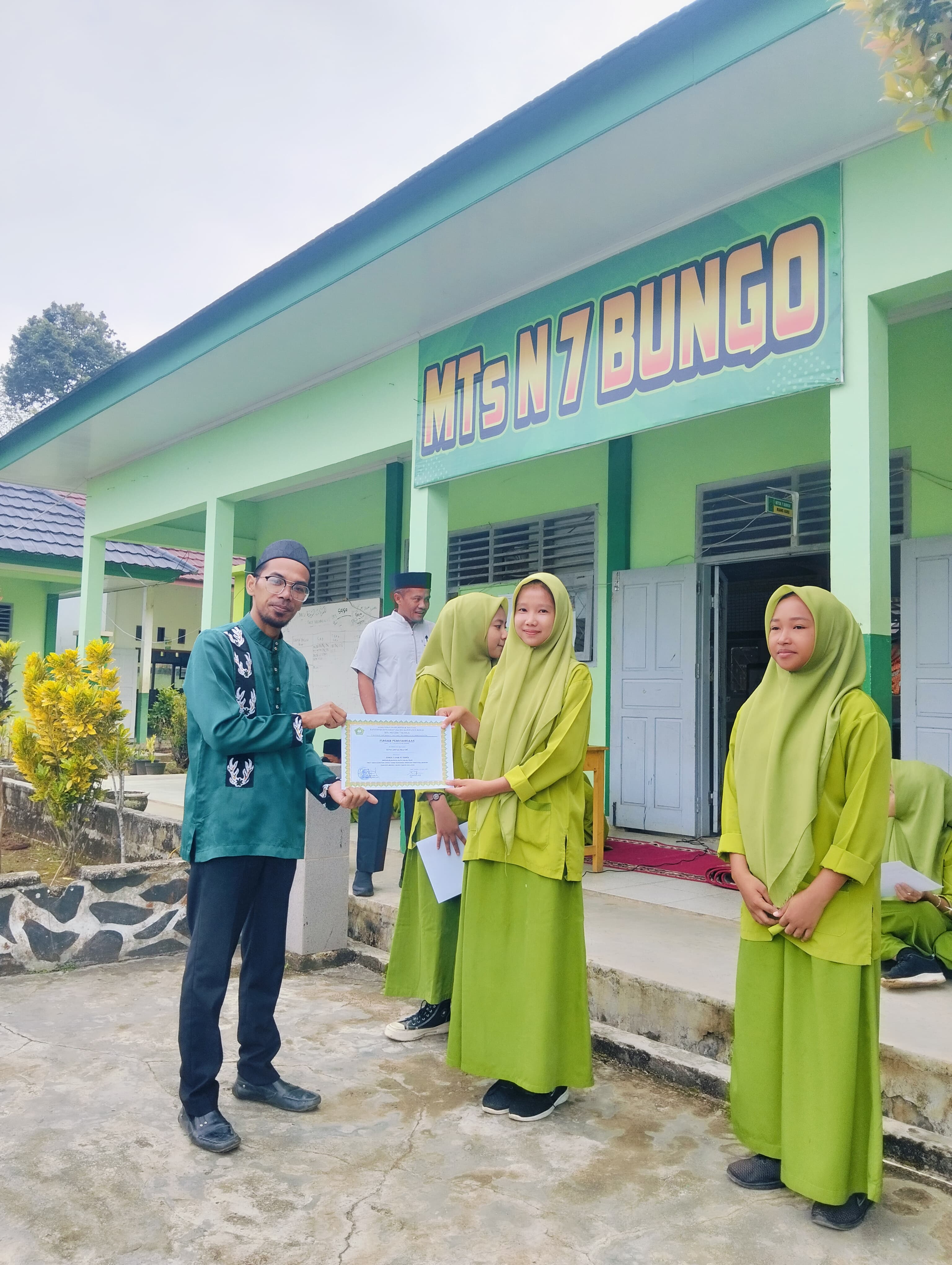 Tanah Tumbuh (MTsN7_Bungo) — Kepala MTs Negeri 7 Bungo Bapak Firdaus.Ar, S.Pd.I, memberikan penghargaan kepada siswa-siswi kelas IX yang meraih nilai tertinggi dalam Ujian Madrasah Tahun Pelajaran 2024/2025. Penghargaan ini diberikan sebagai bentuk apresiasi atas kerja keras, kedisiplinan, dan semangat belajar yang telah ditunjukkan oleh para siswa dalam mencapai prestasi akademik yang membanggakan.