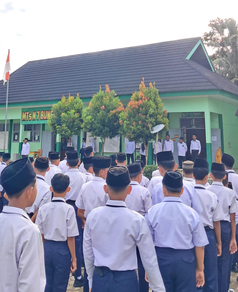 Bertindak sebagai pembina upacara adalah Kepala MTsN 7 Bungo, Bapak Firdaus Ar, S.Pd.I, yang memimpin jalannya upacara secara langsung. Sementara itu, petugas upacara merupakan siswa-siswi pilihan dari anggota OSIM yang telah dipersiapkan secara matang. Rangkaian upacara dimulai dengan pengibaran bendera Merah Putih yang diiringi lagu kebangsaan Indonesia Raya, dilanjutkan dengan pembacaan teks Pancasila, UUD 1945, dan doa bersama.