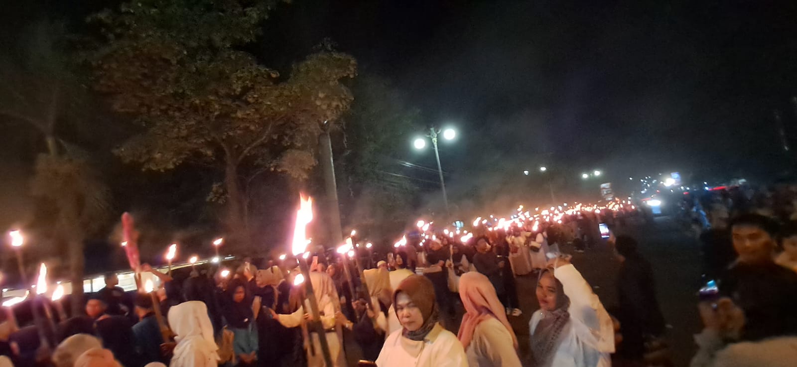 Rombongan perwakilan dari MTsN 7 Bungo hadir dengan penuh semangat, tampil kompak mengenakan busana islami seragam, dan membawa obor sambil menyusuri rute yang telah ditentukan. Kehadiran mereka menambah semarak suasana malam pergantian tahun hijriah tersebut.