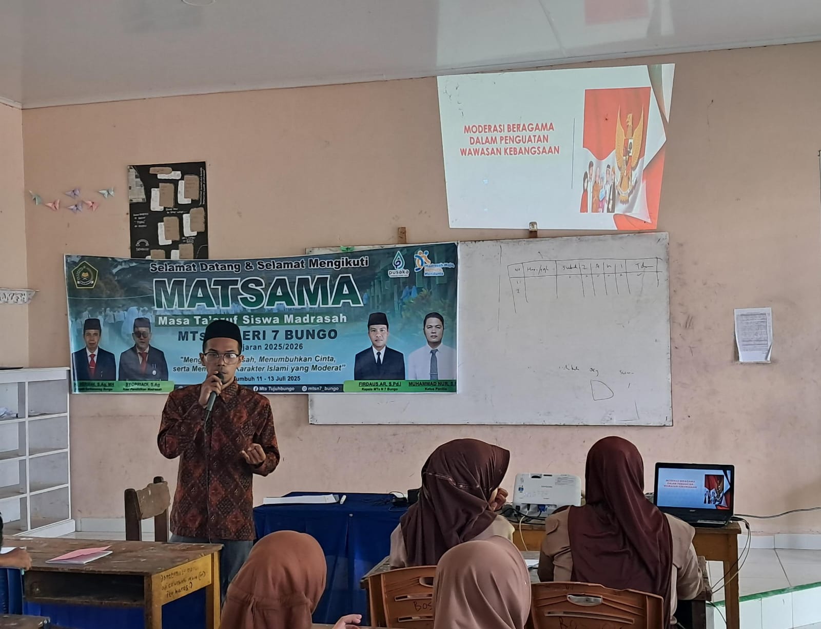 Tanah Tumbuh (MTsN7_Bungo) – Dalam rangka Masa Ta’aruf Siswa Madrasah (MATSAMA) tahun ajaran 2025/2026, MTsN 7 Bungo mengangkat tema penting bertajuk “Moderasi Beragama†sebagai materi utama untuk membentuk karakter peserta didik baru. Materi ini disampaikan secara langsung oleh Bapak Muhsinin, S.Pd, pada hari kedua pelaksanaan MATSAMA, Sabtu (12/7/2025).