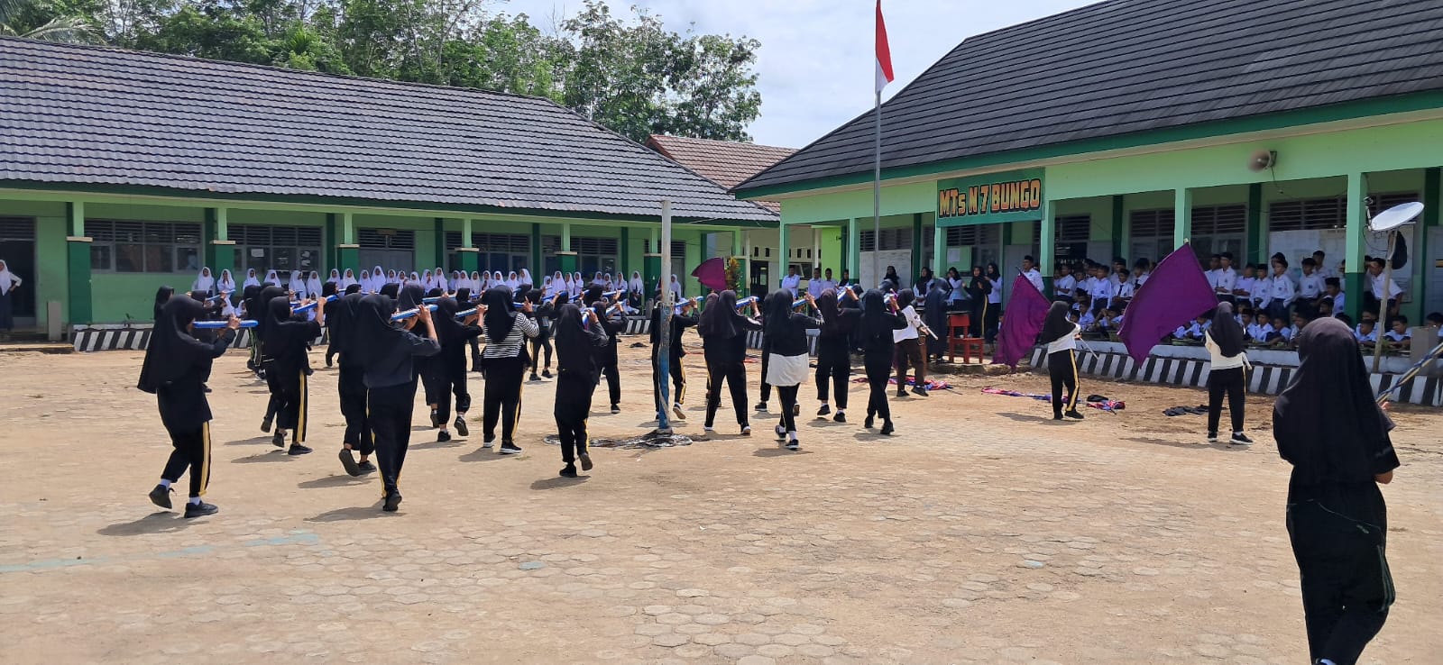 Tanah Tumbuh (MTsN7_Bungo) — Tim Marching Band Bahana Syahdu dari MTs Negeri 7 Bungo berhasil mencuri perhatian seluruh warga madrasah dalam penampilan yang digelar di halaman utama madrasah pada Senin, (11/8/2025).
