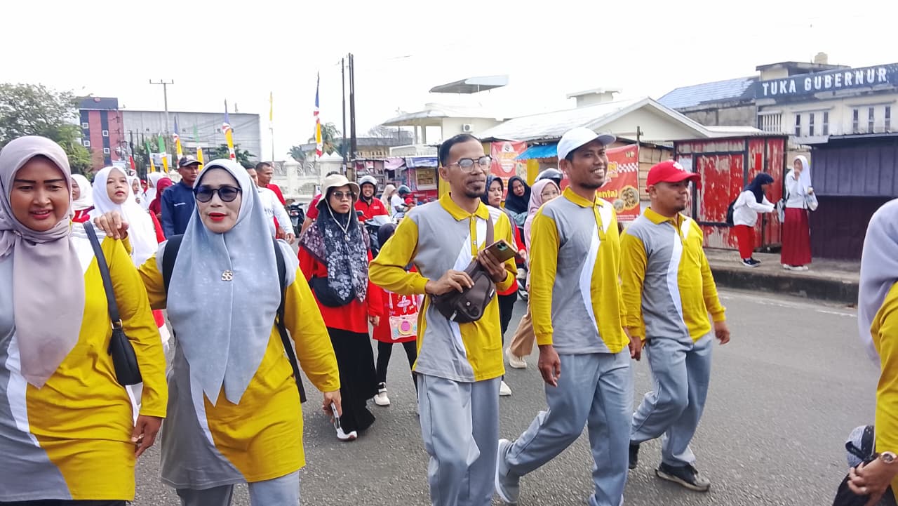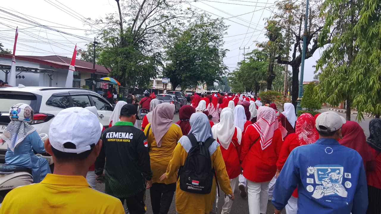 Muara Bungo (MTsN7_Bungo) – Dalam rangka memperingati Hari Ulang Tahun (HUT) ke-80 Republik Indonesia, Keluarga Besar MTs Negeri 7 Bungo yang terdiri dari Aparatur Sipil Negara (ASN), baik Pegawai Negeri Sipil (PNS), Calon PNS (CPNS), serta Pegawai Pemerintah dengan Perjanjian Kerja (PPPK) turut berpartisipasi memeriahkan kegiatan Jalan Santai Kerukunan Umat Beragama yang diselenggarakan oleh Kantor Kementerian Agama Kabupaten Bungo, Sabtu (16/8/2025).