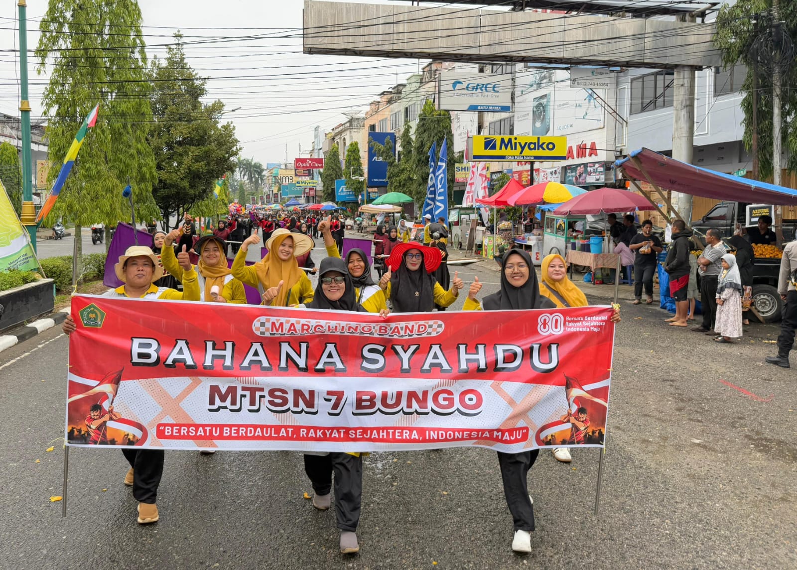 “Kami hadir bukan hanya untuk memeriahkan peringatan HUT ke-80 RI, tetapi juga menunjukkan bahwa MTsN 7 Bungo selalu siap berkontribusi dalam berbagai kegiatan positif di Kabupaten Bungo,†ujarnya.