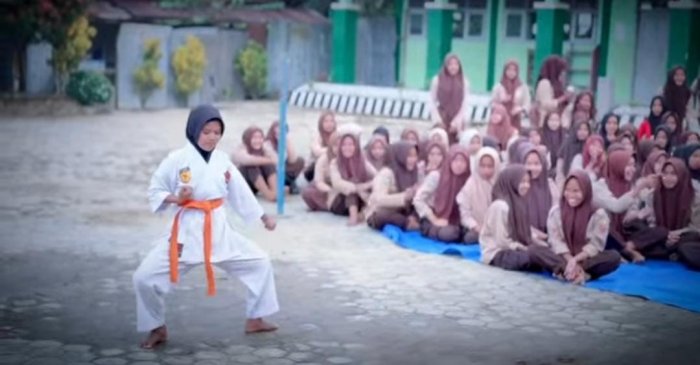 Dengan penuh percaya diri, Maura menampilkan gerakan yang tegas, lincah, dan penuh kekuatan. Aksi bela diri yang diperagakannya tidak hanya menunjukkan keterampilan teknik, tetapi juga mencerminkan kedisiplinan serta ketekunan dalam berlatih.