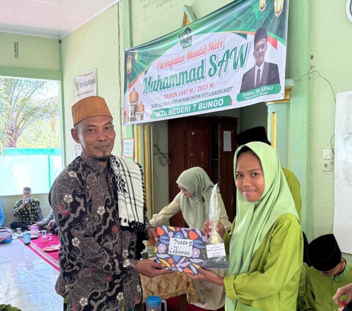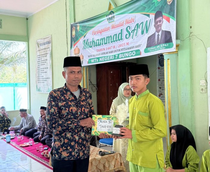 Tanah Tumbuh (MTsN7_Bungo) - Rangkaian peringatan Maulid Nabi Muhammad SAW 1447 H di MTs Negeri 7 Bungo resmi berakhir dengan penuh khidmat dan kebersamaan. Acara penutupan berlangsung pada Rabu (10/9/2025) di Musholla madrasah, ditandai dengan pengumuman para pemenang hadiah perlombaan yang sebelumnya digelar dalam rangka memeriahkan peringatan kelahiran Nabi Muhammad SAW.