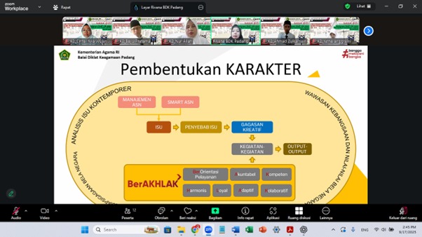 Tanah Tumbuh (MTsN 7 Bungo), Rabu (17/9/2025) - Pelatihan Dasar (LATSAR) CPNS memasuki hari kelima dengan materi yang sangat fundamental: Nilai-Nilai Dasar ASN. Kegiatan pembelajaran yang dilakukan secara daring (synchronous) ini dipandu oleh narasumber kompeten, Rivana Upitasari, S.E., M.M., yang membawakan materi dengan tema utama BerAKHLAK - akronim dari nilai-nilai dasar yang wajib dimiliki setiap Aparatur Sipil Negara (ASN), yaitu: