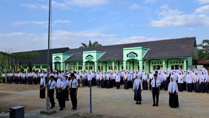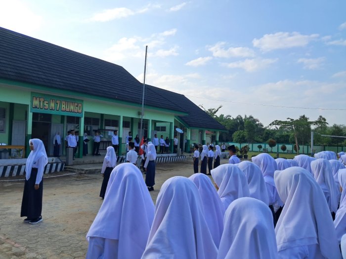 Tanah Tumbuh (MTsN 7 Bungo) - Madrasah Tsanawiyah Negeri (MTsN) 7 Bungo kembali melaksanakan kegiatan upacara bendera rutin pada Senin pagi (22/9/2025). Upacara yang dilangsungkan di halaman utama madrasah ini berlangsung dengan tertib, khidmat, dan penuh semangat. Kegiatan ini diikuti oleh seluruh warga madrasah, mulai dari Kepala Madrasah, dewan guru, staf tata usaha, hingga siswa-siswi MTsN 7 Bungo.