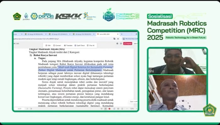 Tanah Tumbuh (MTsN 7 Bungo) - Wakil Kepala MTsN 7 Bungo Bidang Kurikulum, Bapak Mhd. Hendrizal, S.Pd., menghadiri sosialisasi Kompetisi Robotik Madrasah (MRC) 2025 yang mengusung tema "Robotic Technology for a Green Future". Kegiatan ini dilaksanakan secara daring melalui platform Zoom Meeting dan disiarkan langsung melalui kanal YouTube Direktorat KSKK Madrasah Kementerian Agama RI pada Selasa (23/9/2025).