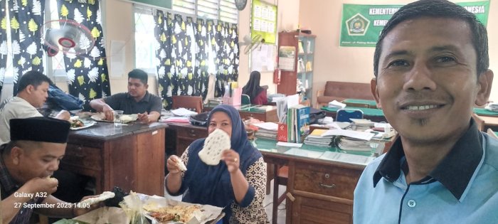 Tanah Tumbuh (MTsN 7 Bungo) - Dalam upaya mempererat tali silaturahmi dan memperkuat semangat kebersamaan, MTsNegeri 7 Bungo menggelar acara makan siang bersama di ruang guru pada Sabtu (27/9/2025). Kegiatan ini dihadiri oleh para guru dan staf yang berlangsung dalam suasana penuh kehangatan dan kekeluargaan.