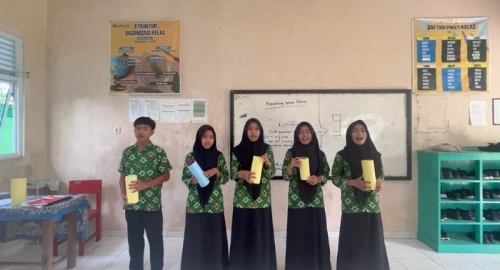 Setiap kelompok diberikan tugas untuk membuat model tabung secara kreatif, menghitung volumenya, dan kemudian mempresentasikan hasilnya di depan kelas. Para siswa terlihat sangat antusias dan kompak dalam mengerjakan tugas mereka. Banyak di antara mereka menunjukkan inisiatif dalam pembuatan model serta penjelasan konsep yang telah mereka pelajari.
