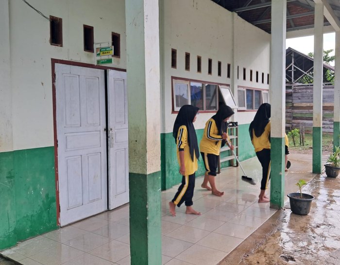 Tim Humas MTsN 7 Bungo mengamati langsung aktivitas para siswa yang membersihkan perkarangan kelas dan halaman madrasah. Beberapa siswa terlihat sibuk merapikan taman yang sedang dalam proses perbaikan di depan kelas. Selain itu, mereka juga menyapu, memungut sampah, dan mengepel lantai dengan penuh kesungguhan.
