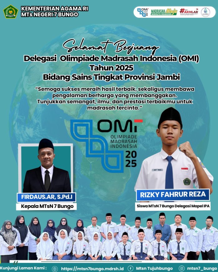 Olimpiade Madrasah Indonesia (OMI) adalah wadah kompetisi akademik yang diselenggarakan Kementerian Agama RI, sebagai ajang pencarian bibit unggul madrasah di seluruh Indonesia dalam berbagai bidang ilmu. Keikutsertaan Rizky menunjukkan bahwa siswa MTsN 7 Bungo mampu bersaing di level provinsi dan siap melangkah ke level nasional.