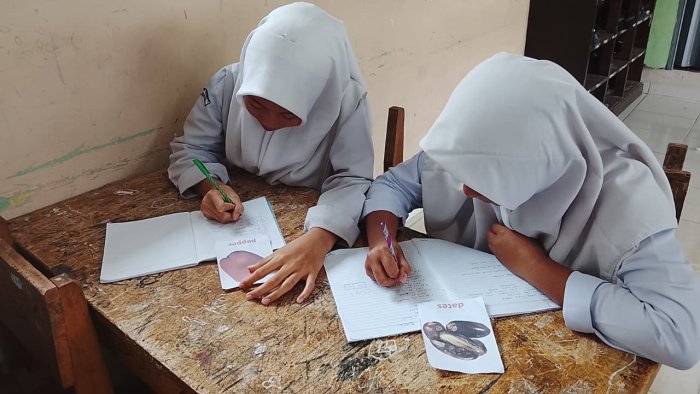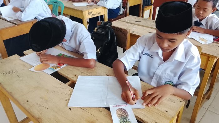 Untuk membantu siswa mengenal kosakata baru, Ibu Cinta menggunakan media pembelajaran berupa flashcard gambar buah dan sayuran hasil print out. Melalui media visual ini, siswa tampak lebih mudah memahami arti kata sekaligus lebih berani berlatih berbicara dalam Bahasa Inggris.