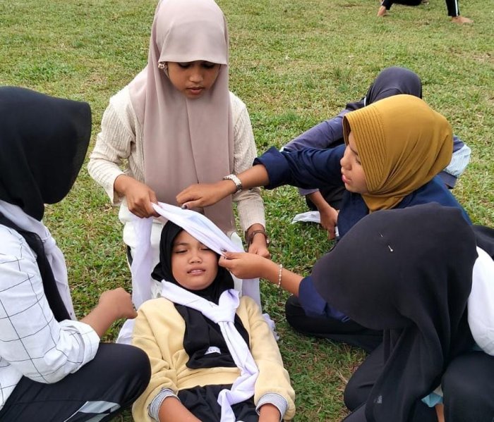 Tanah Tumbuh (MTsN 7 Bungo) - Ekstrakurikuler Palang Merah Remaja (PMR) MTsN 7 Bungo kembali melaksanakan latihan rutin pada Jum'at (10/10/2025). Kegiatan yang berlangsung di lapangan madrasah ini diisi dengan simulasi penanganan gempa bumi, evakuasi korban, serta pertolongan pertama pada korban kecelakaan.