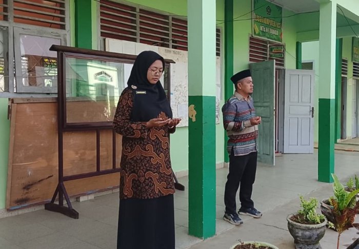 Tanah Tumbuh (MTsN 7 Bungo) - Mengawali kegiatan senam rutin di halaman madrasah, Kamis (16/10/2025), Kepala MTsN 7 Bungo, Bapak Firdaus.Ar, S.Pd.I, memimpin apel sekaligus menyampaikan kabar duka kepada seluruh warga madrasah yang hadir. Dalam amanatnya, beliau menginformasikan bahwa salah satu keluarga besar MTsN 7 Bungo, Bapak Sandi Padirin, suami dari Ibu Rubiah, S.Pd, telah berpulang ke rahmatullah.