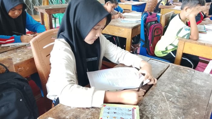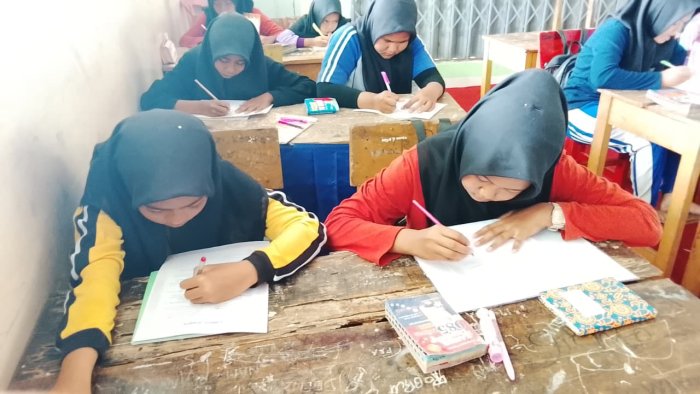 Para siswa mendengarkan lagu sambil membaca lirik dengan saksama, kemudian mengerjakan lembar kerja berupa "missing words" yang harus mereka lengkapi berdasarkan lirik yang didengar. Metode ini tidak hanya melatih ketelitian dan daya dengar siswa, tetapi juga membantu mereka memahami kosakata serta struktur bahasa Inggris dalam konteks yang menyenangkan.