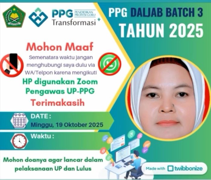 Tanah Tumbuh (MTsN 7 Bungo) - Dua orang guru MTsNegeri 7 Bungo, yakni Ibu Irma Yulia, S.Pd. dan Ibu Widyawati, S.Pd.I., dijadwalkan akan mengikuti Uji Pengetahuan PPG (UPPG) Batch 3 pada Minggu (19/10/2025). Kegiatan ini merupakan bagian dari tahapan penting dalam pelaksanaan Program Pendidikan Profesi Guru (PPG) yang menjadi syarat utama untuk memperoleh sertifikat pendidik profesional.