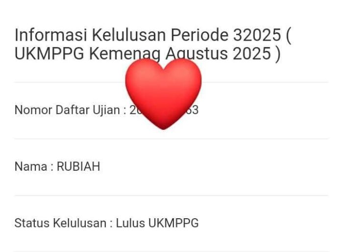 Tanah Tumbuh (MTsN 7 Bungo) - Kabar gembira datang dari keluarga besar MTsNegeri 7 Bungo. Salah satu tenaga pendidik terbaiknya, Ibu Rubiah, S.Pd, berhasil lulus dalam Uji Kompetensi Mahasiswa Pendidikan Profesi Guru (UKMPPG) Dalam Jabatan Batch II Tahun 2025. Hasil kelulusan tersebut ia peroleh pada Selasa (21/10/2025) melalui laman resmi https://ukm.ppg.dikdasmen.go.id.