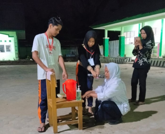 Menariknya, pada malam harinya (Sabtu malam Minggu), peserta mendapatkan tambahan wawasan penting melalui materi teori dan praktik Pertolongan Pertama pada Kecelakaan (P3K) serta Pertolongan Keluarga (PK). Dalam sesi tersebut, para peserta dibimbing untuk memahami teknik dasar pertolongan pertama dan pentingnya menjaga kebersihan diri, salah satunya melalui praktik mencuci tangan dengan benar.