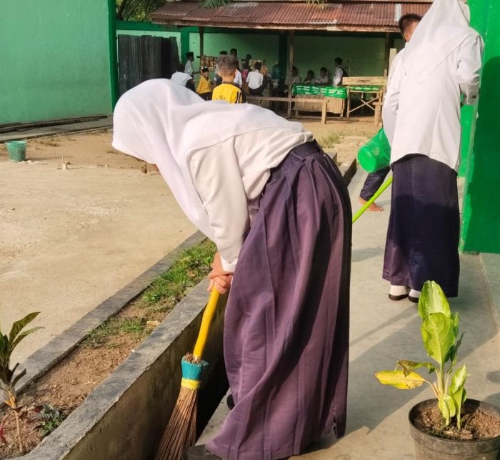 Dengan panduan para guru, siswa-siswi tampak bekerja sama menyapu halaman, memungut sampah, serta membersihkan dan menyiram taman. Kegiatan tersebut tidak hanya menciptakan lingkungan yang bersih dan nyaman, tetapi juga menumbuhkan rasa tanggung jawab serta kebersamaan di antara siswa.