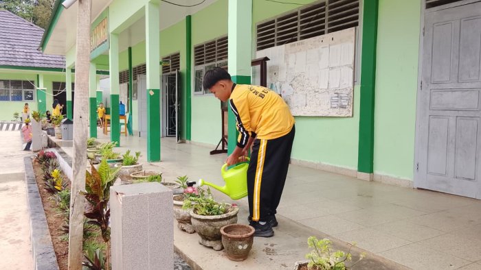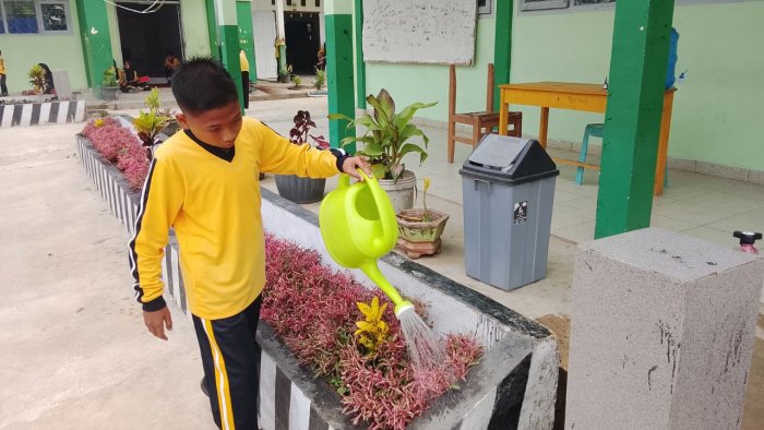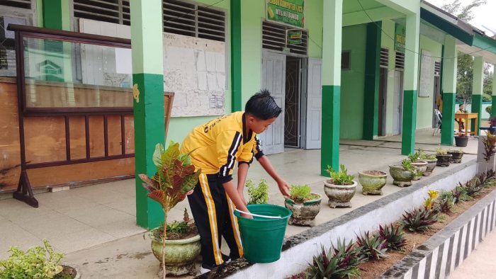 Tanah Tumbuh (MTsN 7 Bungo) - Suasana pagi di MTsNegeri 7 Bungo selalu terlihat hidup dan penuh semangat. Setiap hari, para guru dan siswa dengan antusias melaksanakan kegiatan kebersihan dan penghijauan di lingkungan madrasah. Pada Kamis (6/11/2025), seperti biasa, mereka tampak bergotong royong membersihkan pekarangan, menyapu halaman, memungut sampah, serta merawat dan menyiram tanaman yang tumbuh di sekitar area madrasah, terutama di depan kelas masing-masing.