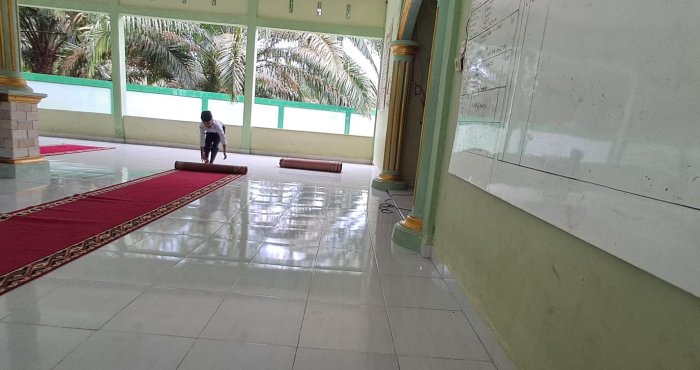 Kegiatan bersih-bersih dilaksanakan dengan penuh semangat dan kebersamaan. Para siswa terlihat antusias membersihkan area musholla, mulai dari bagian dalam, menyapu lantai, menata karpet, hingga merapikan teras dan lingkungan sekitarnya. Suasana kerja sama dan kekompakan tampak jelas selama kegiatan berlangsung.
