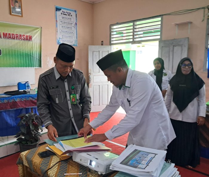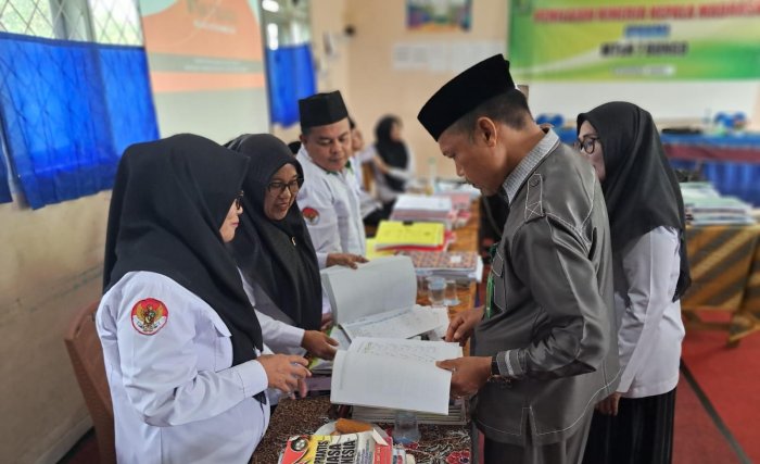 Selanjutnya, tim penilai melakukan verifikasi data, pemeriksaan dokumen, serta klarifikasi langsung terhadap indikator kinerja yang telah dipaparkan. Dalam arahannya, Bapak H. Asrul, S.Ag., M.Pd.I menyampaikan bahwa PKKM bukan sekadar proses penilaian, namun juga menjadi sarana pembinaan dan refleksi untuk meningkatkan kualitas kepemimpinan kepala madrasah serta mendorong kemajuan madrasah ke depan. Ia juga mengapresiasi kerja keras kepala madrasah, guru, dan tenaga kependidikan MTsN 7 Bungo dalam mempersiapkan pelaksanaan PKKM dengan baik, serta kelengkapan dokumen yang ditampilkan sesuai dengan instrumen penilaian.