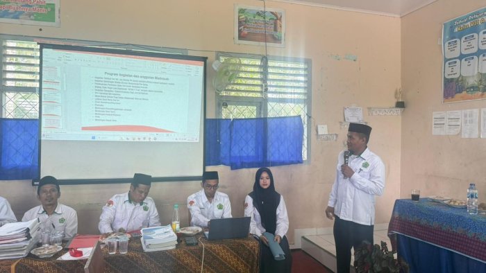 Pada kesempatan tersebut, Kepala MTsNegeri 7 Bungo, Bapak Firdaus.Ar, S.Pd.I, memaparkan berbagai capaian program kerja, peningkatan mutu layanan pendidikan, serta upaya pengembangan madrasah sepanjang Tahun 2025. Selain pemaparan lisan dan dokumen, kepala madrasah juga menayangkan video capaian dan perkembangan MTsN 7 Bungo selama tahun 2025 sebagai bentuk dokumentasi dan transparansi kinerja.