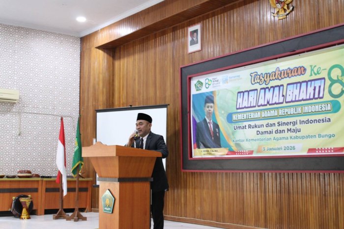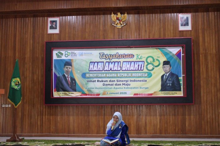 Muara Bungo (Humas MTsN 7 Bungo) - Kepala Madrasah Tsanawiyah Negeri (MTsN) 7 Bungo, Firdaus.Ar, S.Pd.I bersama Guru dan Tenaga Kependidikan (GTK), menghadiri Acara Tasyakuran Hari Amal Bakti (HAB) Kementerian Agama Republik Indonesia ke-80 Tahun 2026 yang berlangsung khidmat dan penuh kebersamaan. Kegiatan tersebut dilaksanakan di Aula Kantor Kementerian Agama Kabupaten Bungo, Sabtu (3/1/2026).