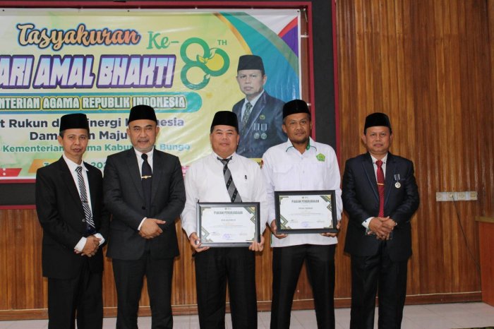 Penghargaan tersebut diserahkan langsung oleh Bupati Bungo, Bapak H. Dedy Putra, SH, M.Kn, didampingi oleh Kepala Kantor Kementerian Agama Kabupaten Bungo, Bapak H. Herman, S.Ag, MH, serta Kasubbag Tata Usaha, Bapak H. Syakroni, S.Ag, M.Sy.