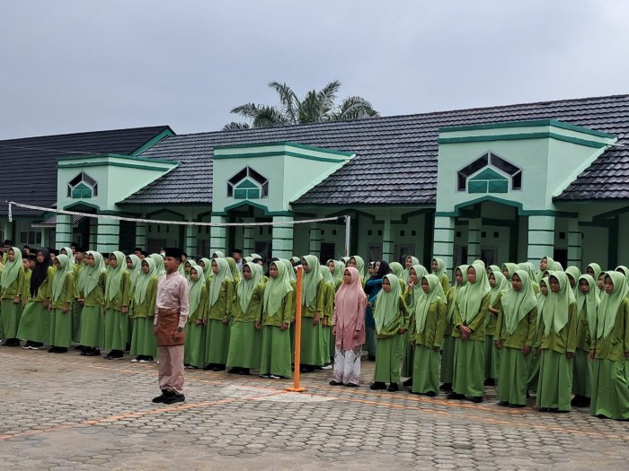 Langit kelabu yang menaungi kawasan MTsN 7 Bungo justru menghadirkan suasana syahdu di antara bangunan madrasah yang bercat hijau. Kehangatan dan semangat kebersamaan begitu terasa, menandai kesiapan seluruh warga madrasah untuk kembali menapaki perjalanan pendidikan usai masa libur semester.