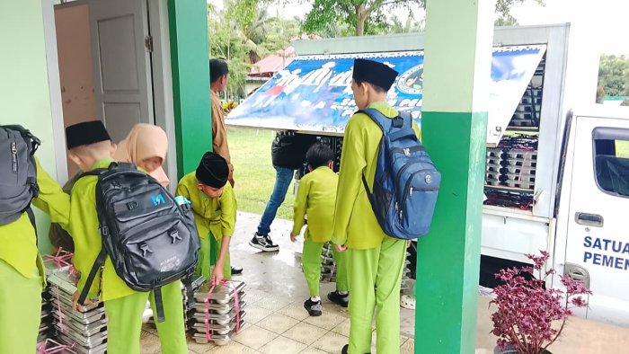"Alhamdulillah, pendistribusian MBG di madrasah berjalan lancar, meski ada beberapa kendala seperti hujan yang belum reda. Akan tetapi para siswa kembali merasakan manfaat MBG pada hari kedua ini," ujar Ibu Misfiawati seusai mendistribusikan MBG kepada seluruh siswa.