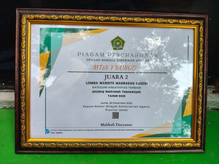 Pada momentum bersejarah ini, MTs Negeri 7 Bungo turut mengukir prestasi membanggakan di tingkat Provinsi Jambi. Madrasah tersebut berhasil meraih Juara 2 Lomba Video Penerapan Eco-Teologi (Kemenag Asri) serta Juara 2 Lomba Website Madrasah Negeri Kategori Kreativitas Terbaik Jenjang MTs Tahun 2025. Raihan ini menempatkan MTs Negeri 7 Bungo sebagai salah satu madrasah yang konsisten berinovasi dalam digitalisasi dan penguatan nilai-nilai lingkungan di satuan pendidikan.