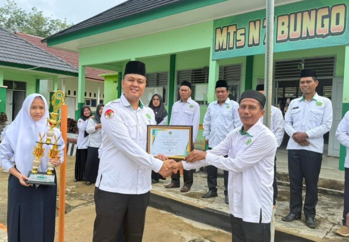 Prosesi penyerahan piala dan piagam disaksikan oleh seluruh dewan guru, tenaga kependidikan, serta siswa MTsN 7 Bungo yang memenuhi halaman madrasah. Tepuk tangan meriah menggema saat piala dan piagam diberikan, menandai kebanggaan seluruh warga madrasah atas pencapaian yang berhasil diraih Tim Humas.
