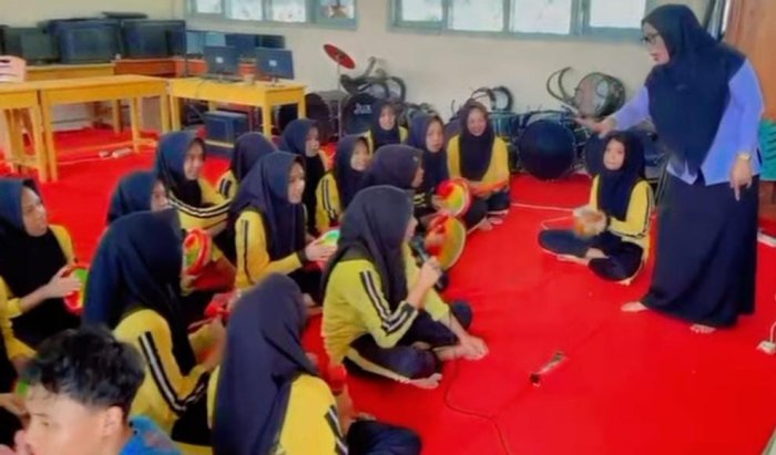 Tanah Tumbuh (MTsN 7 Bungo) - Menjelang puncak peringatan Hari Besar Islam Isra Miraj Nabi Muhammad SAW 1447 H/2026 M di MTsN 7 Bungo, Tim Kasidah Rebana menggelar latihan intensif di salah satu ruangan madrasah pada Selasa (20/1/2026) saat jam istirahat. Latihan ini dibimbing langsung oleh pembina ekstrakurikuler rebana, Ibu Zaleha, S.Ag.