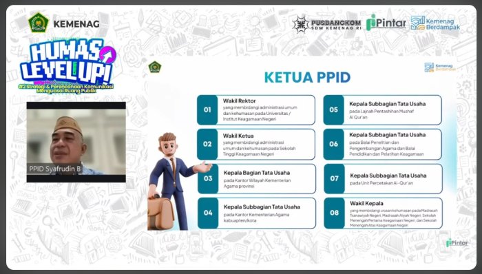 Dalam kegiatan tersebut, peserta mendapatkan pemaparan materi dari narasumber yang kompeten di bidangnya, yakni Syafrudin, Ketua Tim PPID Biro Humas dan Komunikasi Publik Kementerian Agama RI. Sementara itu, kegiatan dipandu oleh Riri Idryani, yang merupakan Pranata Humas Kemenag RI. Sesi pembelajaran berlangsung pada pukul 13.30 hingga 15.30 WIB dengan pembahasan yang mendalam mengenai implementasi kebijakan terbaru terkait pengelolaan informasi dan dokumentasi di lingkungan Kementerian Agama.