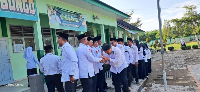 Tanah Tumbuh (Humas) - Suasana hangat dan penuh kebersamaan mewarnai pelaksanaan kegiatan Halal bi Halal di MTsN 7 Bungo seusai Upacara Bendera perdana pasca libur Idul Fitri 1447 H, Senin (30/3/2026). Kegiatan ini diikuti oleh seluruh warga madrasah, mulai dari kepala madrasah, dewan guru, staf tata usaha, hingga para siswa.