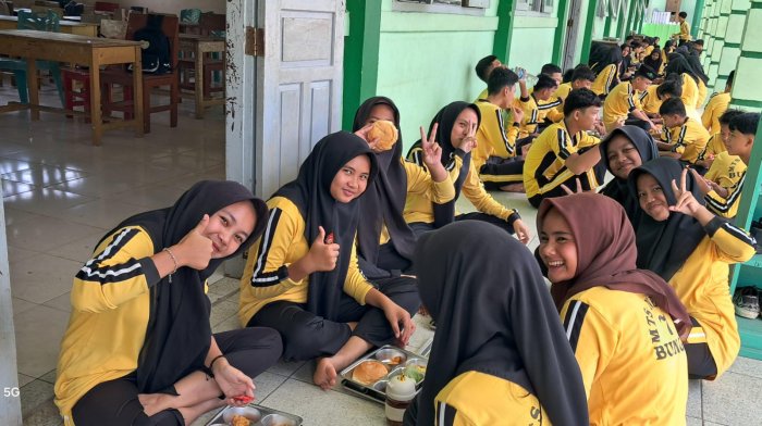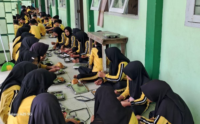 Tanah Tumbuh (Humas MTsN7 Bungo) - Suasana hangat dan penuh kebersamaan terasa begitu kental saat seluruh siswa MTsN 7 Bungo menikmati program Makan Bergizi Gratis (MBG) pada Kamis (2/4/2026). Kegiatan makan bersama ini tidak sekadar menjadi rutinitas, tetapi juga menghadirkan pengalaman yang berkesan dan menyenangkan bagi para siswa.