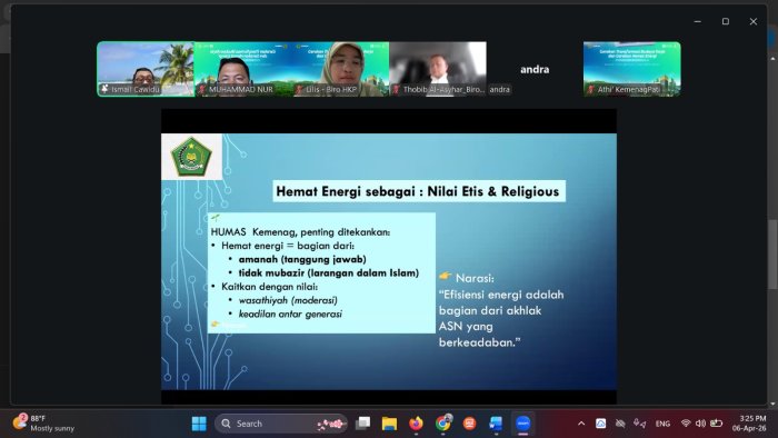 Sementara itu, Staf Khusus Menteri Agama RI, Ismail Cawidu, yang turut menjadi pemateri, menyampaikan bahwa gerakan hemat energi tidak sekadar kebijakan administratif, tetapi juga memiliki nilai etis dan religius yang mendalam. Ia menegaskan bahwa efisiensi energi merupakan bagian dari implementasi akhlak Aparatur Sipil Negara (ASN) yang beradab.