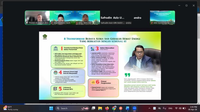 Lebih lanjut, ia menjelaskan bahwa transformasi budaya kerja dan gerakan hemat energi merupakan bagian dari revolusi mental ASN Kementerian Agama. Perubahan ini diharapkan mampu membentuk pola pikir dan budaya kerja yang lebih produktif serta meningkatkan kualitas pelayanan kepada umat dan bangsa.