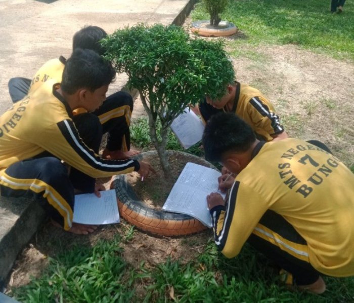 Tanah Tumbuh (Humas) - Proses Kegiatan Belajar Mengajar (KBM) mata pelajaran Ilmu Pengetahuan Alam (IPA) di kelas VII C MTsN 7 Bungo berlangsung dengan suasana berbeda pada Kamis (16/4/2026). Pembelajaran kali ini tidak hanya dilakukan di dalam kelas, melainkan memanfaatkan lingkungan sekitar madrasah sebagai laboratorium alam, sehingga memberikan pengalaman belajar yang lebih bermakna bagi siswa.